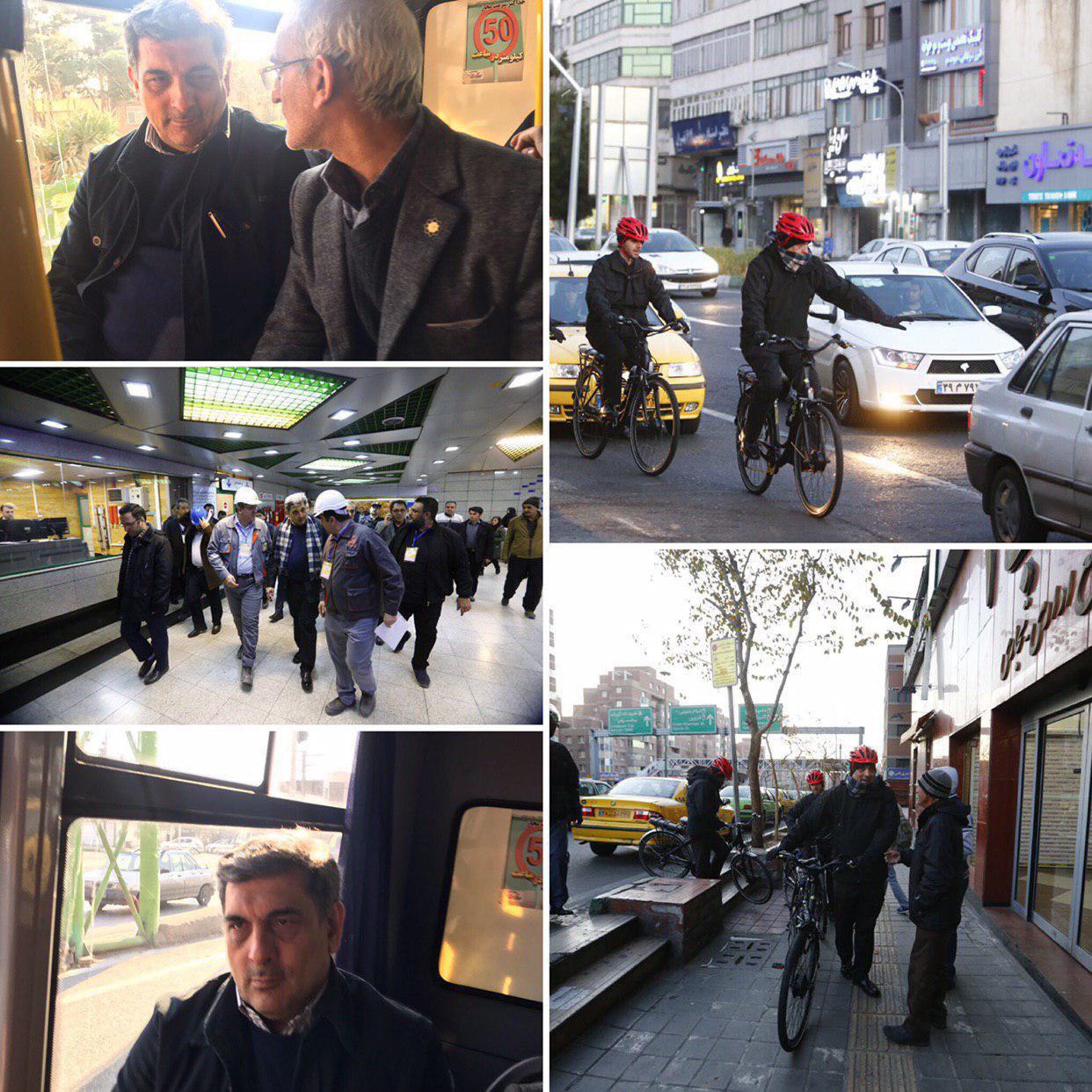 پیروز حناچی، شهردار تهران از دوچرخه، مترو و اتوبوس استفاده کرد تا از خط ٦ مترو بازدید و مرکز معاینه فنی زمان آباد شهرری را افتتاح کند