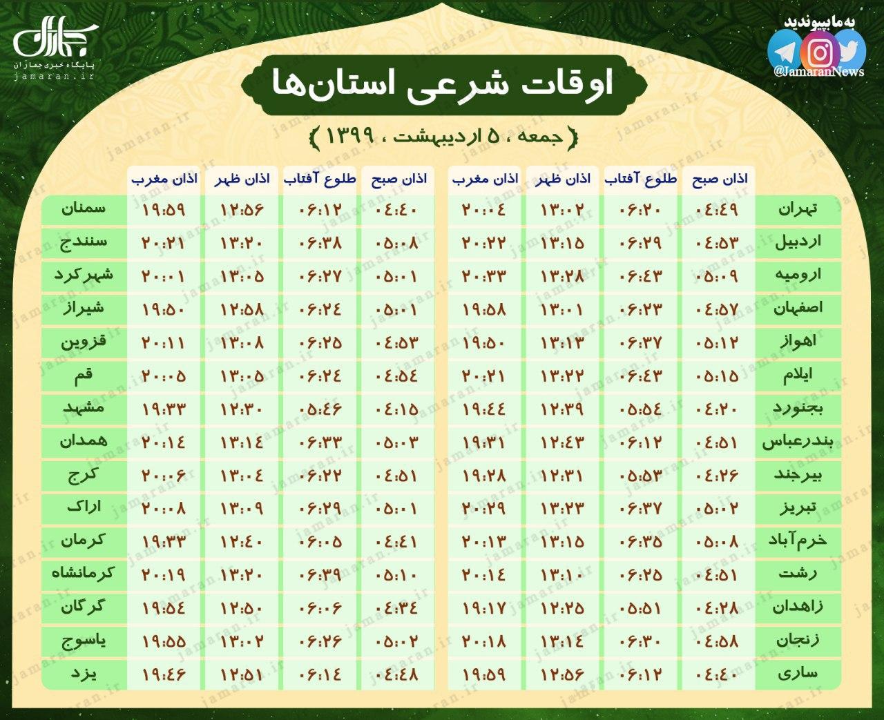به گزارش جماران، برای اطلاع از اوقات شرعی مراکز استان ها در تمام ایام ماه مبارک رمضان می توانید به تصویر فوق مراجعه کنید.