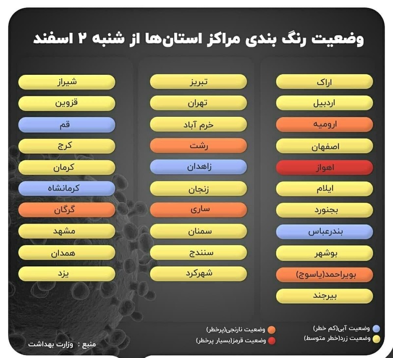 سخنگوی وزارت بهداشت امروز سوم اسفند اعلام کرد: هم اکنون ۱۱ شهرستان قرمز، ۵۲ شهرستان نارنجی، ۲۱۷ شهرستان زرد و ۱۶۸ شهرستان آبی هستند و شهرهای آبادان، اهواز، بندر ماهشهر، خرمشهر، دزفول، دشت آزادگان، رامهرمز، شادگان، شوشتر، کارون و هویزه در وضعیت قرمز قرار دارند.