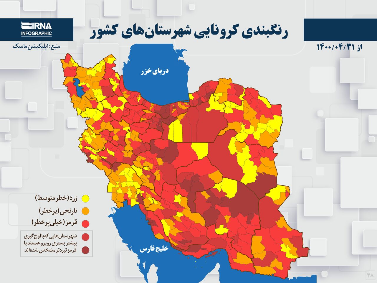 طبق گزارش وزارت بهداشت در پنجشنبه 31 تیر 1400، در حال حاضر ۲۳۲ شهر کشور در وضعیت قرمز، ۱۱۷ شهر در وضعیت نارنجی، ۹۹ شهر در وضعیت زرد قرار دارند.