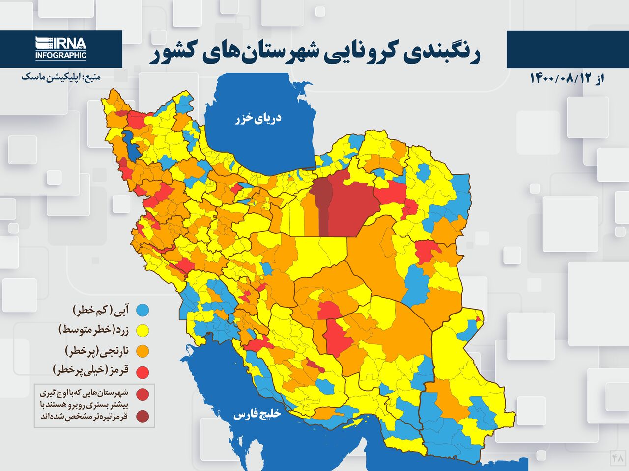 در تازه ترین نقشه کرونایی اسان ها که در اپلیکیشن ماسک منتشر شد و از امروز چهارشنبه ۱۲ آبان اعمال می شود، شهرستان های جلفا، مرند (آذربایجان شرقی)، اشنویه، پیرانشهر، چایپاره (آذربایجان غربی)، مبارکه (اصفهان)، چرداول، دره‌شهر (ایلام)، کیار (چهارمحال و بختیاری)، قائنات (خراسان جنوبی)، خلیل آباد، سبزوار، کاشمر (خراسان رضوی)، دامغان، شاهرود (سمنان)، زابل (سیستان و بلوچستان)، استهبان، سرچهان، ممسنی (فارس)، آبیک (قزوین)، بانه، دیواندره، مریوان (کردستان)، شهربابک (کرمان)، پاوه، روانسر، سرپل ذهاب (کرمانشاه)، پلدختر (لرستان) و مهریز (یزد) در وضعیت قرمز کرونایی محسوب می شوند.