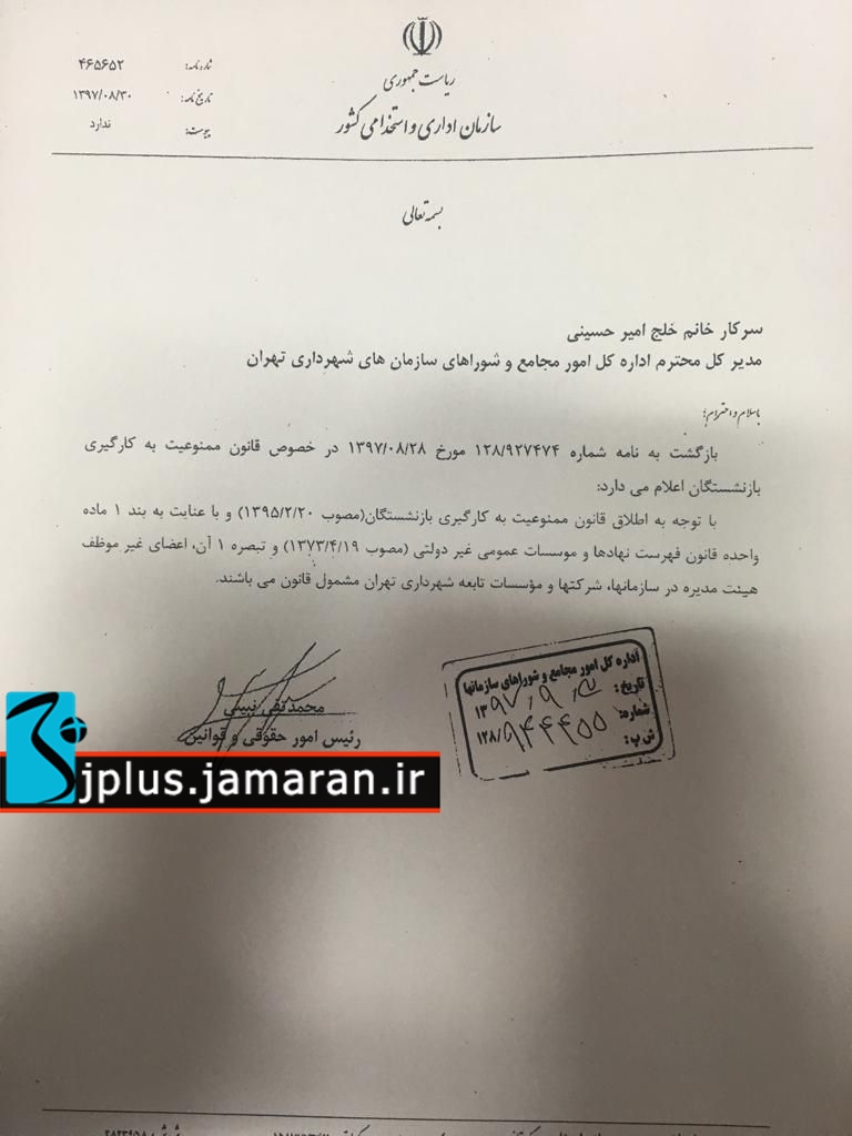 سازمان اداری و استخدامی کشور پاسخ استعلام شهرداری تهران درباره قانون منع بکارگیری بازنشستگان را داد.