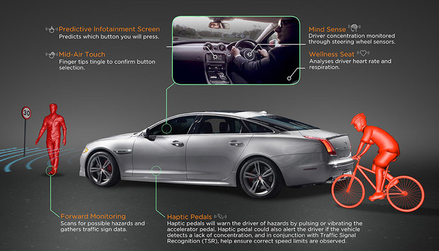 در پروژه جدید جگوار از برترین فناوری های روز دنیا بهره گرفته شده است. در فناوری جدید که به «حس ششم» مشهور شده به مانیتور ضربان قلب و همینطور میزان تنفس راننده پرداخته می شود تا با آنالیز این معیارها بتوان به تمرکز یا عدم تمرکز راننده پی برد و در صورت مشاهده هر گونه اختلال در رانندگی، سیستم به طور خودکار به اجرای کارهایی می پردازد تا جان راننده را از هر گونه خطری حفظ کند.