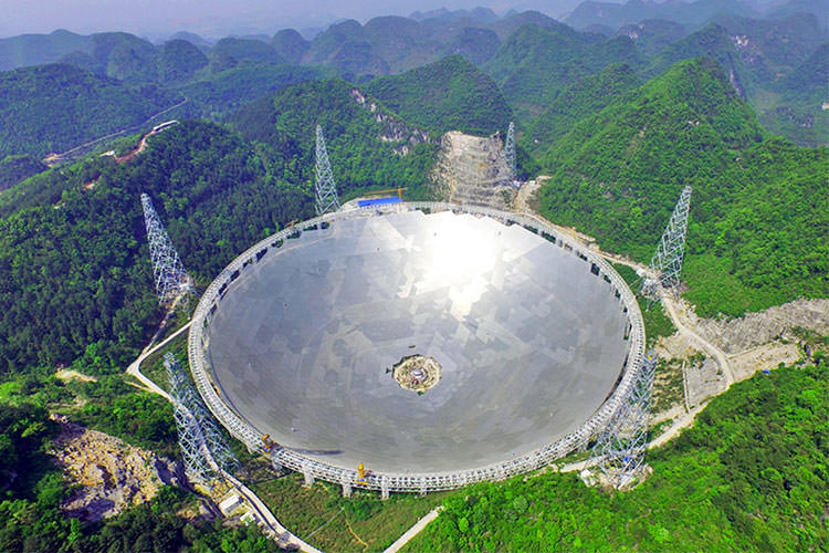 چندین دهه است که بحث موجودات فضایی در بین مردم وجود دارد، اما گویا در چند سال خیر، تب یافتن موجودات فضایی آرام آرام بالا گرفته است. به گزارش جی پلاس، چین اخیرا آخرین قطعهی بزرگترین رادیوتلسکوپ تک دیش جهان را نیز نصب کرده است و این وسیله هم اکنون آمادهی استفاده است. این وسیله را باید یک سازهی بسیار عظیم و فوق بشری نامید، چرا که به تنهایی مساحتی به اندازهی بیش از ۳۰ زمین فوتبال دارد. این سازه یکی از کوهستانهای استان گوئیژو در جنوب غربی چین ساخته شده است. برای درک وسعت این پروژه، میتوانید تصویر زیر را مشاهده کنید. گشادگی دهانهی این تلسکوپ به بیش از نیم کیلومتر میرسد. چینیها میگویند که از این تلسکوپ رادیویی برای شناخت رمزآلود اجزای کیهان همچون سیاهچالهها و تپاخترها استفاده خواهند کرد. همچنین از این رادیوتلسکوپ برای یافتن حیات فرازمینی نیز بهره خواهند برد. این تلسکوپ ۱۸۵ میلیون دلاری میتواند امواج رادیویی را با جزئیاتی فوقالعاده و بسیار بیشتر از هر تلسکوپ