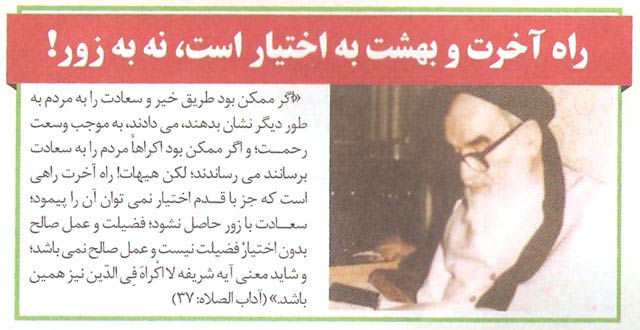 «اگر ممکن بود طریق خیر و سعادت را به مرم، طور طور دیگر نشان بدهند، می دادند به موجب وسعت رحمت و اگر ممکن بود اکراهاً مردم را به سعادت برسانند، می رساندند لکن هیهات! راه آخرت راهی است که جز با قدم اختیار نمی توان آن را پیمود سعادت با زور حاصل نشود فضیلت و عمل صالح بدون اختیار، فضیلت نیست و عمل صالح نمی باشد و شاید معنی آیه شریفه لااکره فی الدین نیز همین باشد.