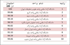 دهقانی گفت: دانشگاه آزاد اسلامی واحد علوم و تحقیقات تهران که یکی از بزرگترین واحد دانشگاهی در بین دانشگاههای آزاد اسلامی کشوراست، در جایگاه نخست فهرست سال 93-1392 قرار گرفته است. دانشگاه آزاد اسلامی واحد کرج نیز توانست با پیشی گرفتن از دانشگاه آزاد واحد مشهد، رتبه دو را کسب کند. دانشگاه آزاد اسلامی واحد مشهد که در رتبهبندی ISC سال 91-1390 حائز رتبه دوم در بین دانشگاههای آزاد کشور شده بود، در سال 93-1392 رتبه سوم جدول را به خود اختصاص داد. همچنین واحدهای تبریز، خوراسگان اصفهان، اراک، تهران شمال، ساوه، شهرضا و تهران جنوب نیز به ترتیب در جایگاههای 4 تا 10 جدول قرار گرفتهاند.