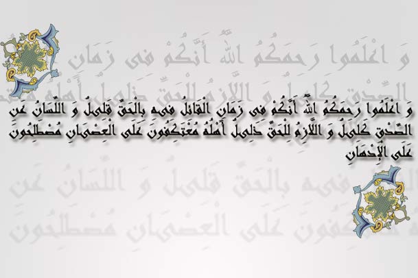 امیر المؤمنین علی علیه السلام: «وَ اعْلَمُوا رَحِمَکُمُ اللَّهُ أَنَّکُمْ فِی زَمَانٍ الْقَائِلُ فِیهِ بِالْحَقِّ قَلِیلٌ وَ اللِّسَانُ عَنِ الصِّدْقِ کَلِیلٌ وَ اللَّازِمُ لِلْحَقِّ ذَلِیلٌ أَهْلُهُ مُعْتَکِفُونَ عَلَى الْعِصْیَانِ مُصْطَلِحُونَ عَلَى الْإِدْهَانِ. رحمت ، خدا بر شما، بدانید که شما در روزگارى به سر مى برید که حق گویان اندک اند و زبان از راستگویى کند است و پیرو حق خوار و بى مقدار، مردمان این زمانه به نافرمانى خو گرفته اند و بر مسامحه (در حق ) با یکدیگر هم داستان شده اند». (نهج البلاغة، خطبه233)