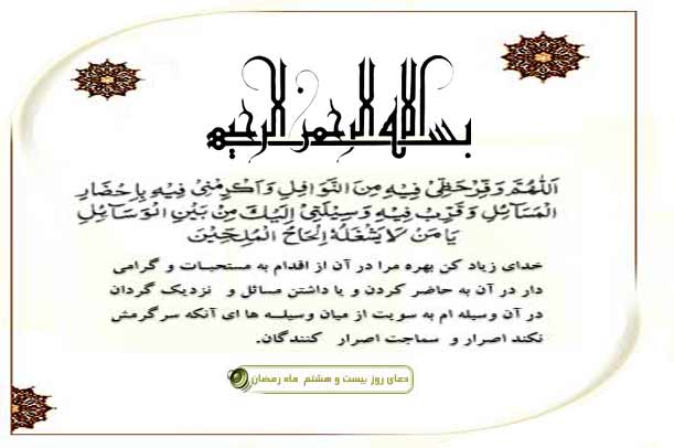 خدایا سرشار کن بهرهام را در این ماه از انجام مستحبات و نوافل و گرامیم دار به یاد داشتن مسائل و نزدیک گردان در آن وسیلهام را بسویت از میان سایر وسایل ای که سرگرمش نکند سماجت سماجت کنندگان