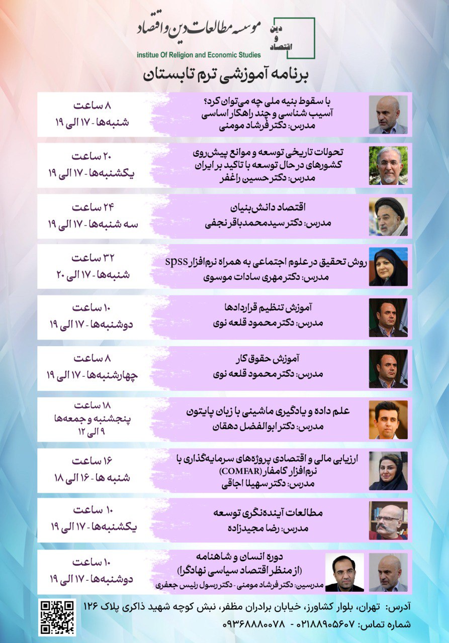 موسسه مطالعات دین و اقتصاد در ترم تابستان ۱۴۰۴ مجموعهای از دورههای آموزشی تخصصی برگزار میکند. این دورهها با موضوعاتی چون اقتصاد دانشبنیان، روش تحقیق با SPSS، یادگیری ماشین با پایتون، حقوق کار، تحلیل شاهنامه از منظر اقتصاد سیاسی و... توسط اساتید برجستهای چون دکتر فرشاد مومنی، دکتر حسین راغفر و دیگر پژوهشگران ارائه میشود. کلاسها از مردادماه آغاز شده و در روزهای مختلف هفته، عمدتاً در ساعات عصر، برگزار میشوند.