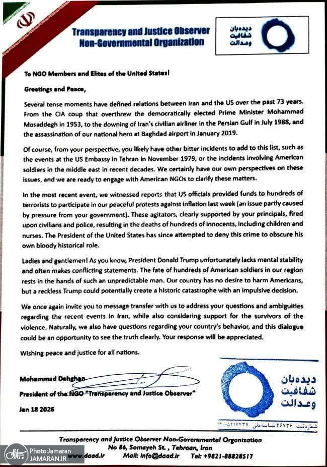 دیده بان شفافیت و عدالت با ارسال نامه ای به انجمن های غیردولتی و نخبگانی آمریکا آنها را به گفتگوی دو طرفه در مورد حوادث اخیر پیش آمده در ایران و رفع ابهامات حاصل شده دعوت کرد و نوشت: خانمها و آقایان، همانطور که می دانید، دونالد ترامپ متاسفانه تعادل روانی ندارد و متناقض حرف می زند. سرنوشت صدها سرباز آمریکایی در منطقه ما به دست این آدم بی اعصاب است. کشور ما مایل به صدمه دیدن آمریکایی ها نیست ولی ترامپ غیرقابل پیش بینی ممکن است با تصمیم های فکر نشده، فاجعه ای تاریخی ایجادکند. ما یکبار دیگر شما را به گفتگو دعوت می کنیم تا بتوانیم ضمن کمک به پیشگیری از فاجعه، به سوالات و ابهامات شما درباره تحولات اخیر ایران پاسخ دهیم. البته ما هم سوالاتی درباره رفتار کشور شما داریم که مایلیم پاسخ آنها را بشنویم.