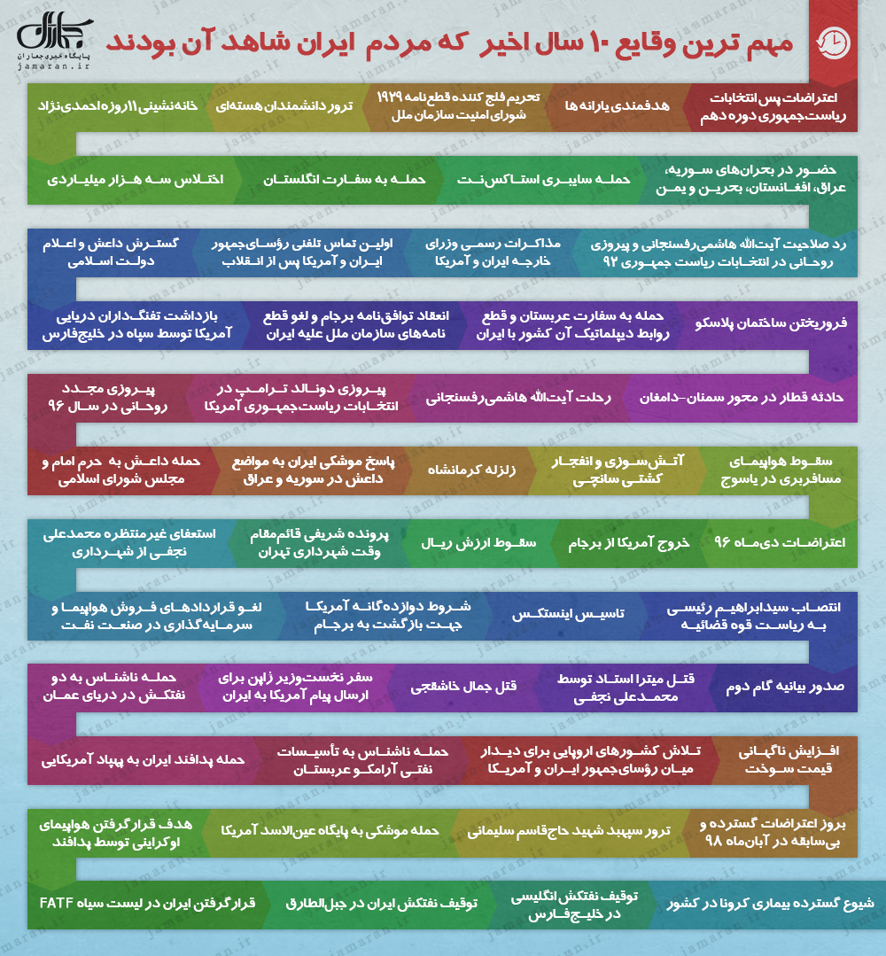 به گزارش جماران، در مفهوم واره بالا، مهم ترین وقایع 10 سال اخیر که مردم ایران شاهد آن بودند را مرور می کنید.