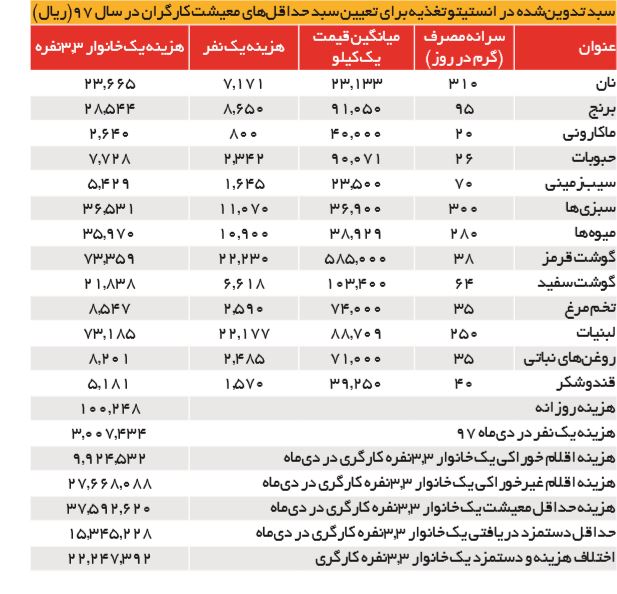 براساس سبد معیشتی خانوارهای کارگری که در انستیتو تغذیه تهیه شده و به تأیید شرکای اجتماعی نیز رسیده است، یک خانوار کارگری 3.3نفره باید ماهانه 992هزار تومان فقط صرف تأمین حداقل‌های خوراکی زندگی کند اما این رقم فقط 26.4درصد از هزینه معیشت این خانوار را شامل می‌شود و باید 2میلیون و 766هزار تومان دیگر نیز برای سایر هزینه‌های غیرخوراکی زندگی صرف شود. این اعداد و ارقام در حالی به تأیید نمایندگان دولت و کارفرمایی رسیده که فعلا حداقل حقوق پرداختی به یک خانوار 3.3نفره کارگری، 1.5میلیون تومان است و عملا پرداختی برای پوشش دادن 2میلیون و 224هزار تومان از باقی‌مانده هزینه معیشت این خانوارها انجام نمی‌شود.
