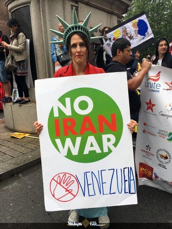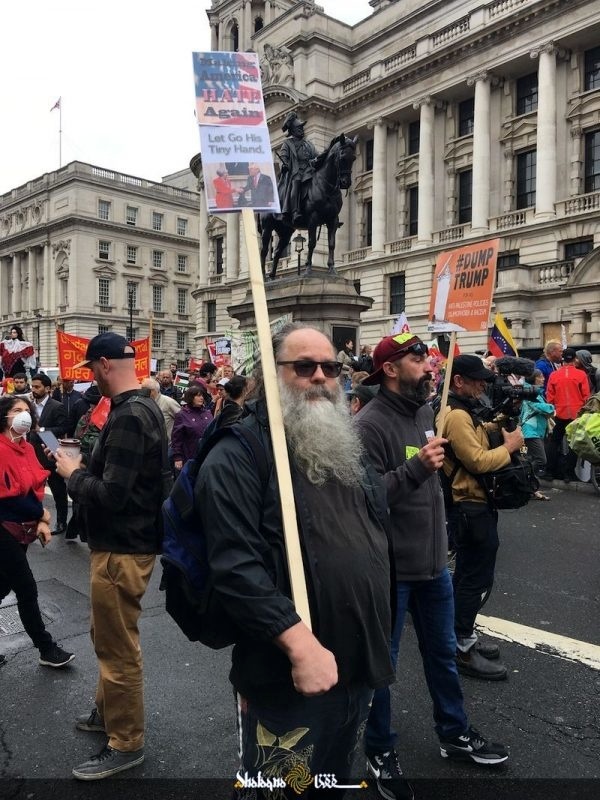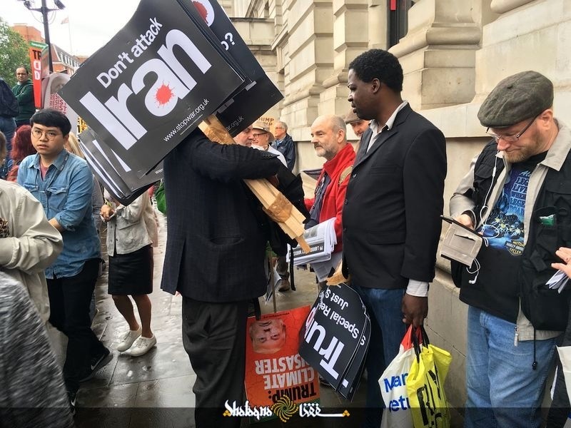 تظاهر کنندگان که پلاکاردهای متعددی از جمله پلاکاردهای ضد جنگ و ضد تهدید ایران در دست داشتند ضمن ابراز ناخرسندی از حضور ترامپ در انگلیس وی را متهم به نادیده گرفتن ارزش های جامعه بریتانیا نمودند. آنها همچنین سیاست های خصمانه آمریکا در قبال ایران٫ فلسطین٫ سوریه و برنامه های تشنج آفرین آمریکا در خاورمیانه را محکوم کردند.