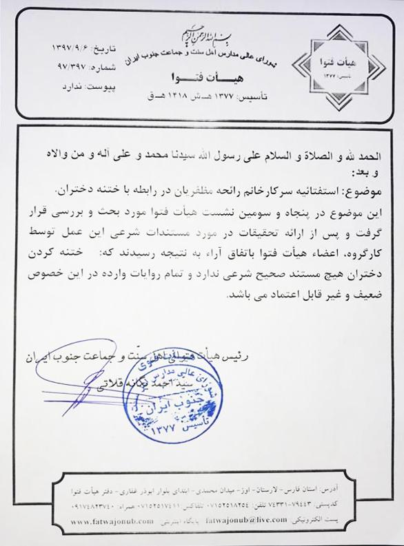 جامعه شناس و پژوهشگر حوزه کودکان گفت: هیات اهل فتوای اهل سنت جنوب ایران در پاسخ به درخواست ما درباره نظر شرع اهل سنت درباره ختنه زنان، فتوایی با محتوای غیرشرعی بودن این عمل صادر و متن آن در اختیار ما قرار گرفت.