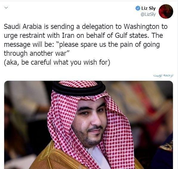 «لیز اسلای» خبرنگار انگلیسی روزنامه واشنگتن پست (مستقر در بیروت) در صفحه توئیتر خود نوشت که دولت سعودی قصد دارد هیأتی به آمریکا اعزام کند تا به نیابت از کشورهای عربی حاشیه خلیج فارس پیامی مهم را به سران واشنگتن ببرد.