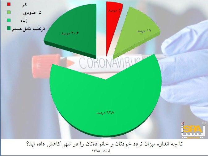 به گزارش جماران؛ طبق نتایج دومین موج از نظرسنجی دفتر مطالعات اجتماعی شهرداری تهران درباره ابعاد شیوع ویروس کرونا که توسط ایسپا انجام شده است، ۶۲.۷ درصد از پاسخگویان گفته اند میزان تردد خود و خانوادهشان را به میزان زیادی در شهر کاهش دادهاند. ۲۰.۳ درصد گفته اند در قرنطینه کامل هستند و ۱۲ درصد تا حدودی میزان تردد خود و خانوادهشان را در شهر کاهش دادهاند. ۵ درصد از پاسخگویان نیز گفته اند به میزان کمی تردد خود و خانوادهشان را در شهر کاهش دادهاند.