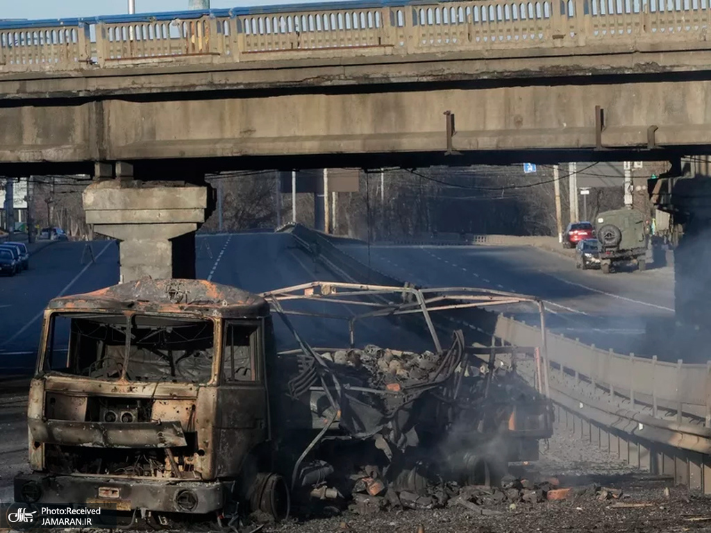 کیف، اوکراین / خودروهای نظامی سوخته در خیابانی در کیف. نیروهای روسیه حملات جدیدی را علیه اهداف اوکراینی در سراسر کشور از جمله کیف انجام می دهند. عکس: EFREM LUKATSKY, AP