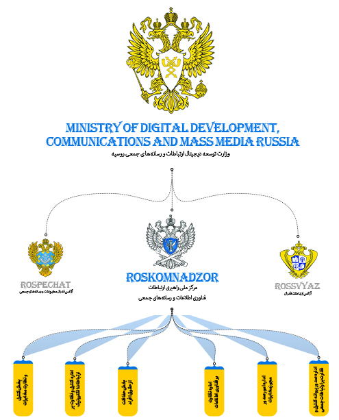 وزارت توسعه دیجیتال، ارتباطات و رسانههای جمعی روسیه از بخشهای مختلفی از جمله آژانس ارتباطات فدرال (Rossvyaz)، آژانس فدرال مطبوعات و رسانههای جمعی (Rospechat) و مرکز ملی راهبری ارتباطات، فناوری، اطلاعات و رسانههای جمعی (Roskomnadzor) تشکیل شده است. سانسور اینترنت در روسیه بر اساس چندین قانون و از طریق مکانیزمهای مختلفی اجرایی میشود. از سال 2012، روسیه یک لیست سیاه متمرکز اینترنتی تهیه کرد که توسط سرویس فدرال نظارت بر ارتباطات، فناوری اطلاعات و رسانههای جمعی یا همان «روس کام نازور» نگهداری میشود. این لیست سیاه برای فیلتر کردن برخی URLها، نامهای دامنه و آدرسهای IP استفاده میشود. «روس کامنازور» یک نهاد اجرایی فدرال در روسیه است که وظیفه اصلی آن، کنترل و نظارت بر رسانهها است. «روس کامنازور» از زیر مجموعههای مختلفی تشکیل شده است. «اداره صدور پروانه و کنترل و نظارت بر ارتباطات جمعی»، «اداره صدور مجوز مخابرات»، «اداره نظارت بر فناوری اطلاعات»، «بخش حفاظت از حقوق افراد»، «اداره کنترل و نظارت بر ارتباطات الکترونیک» و «بخش کنترل و نظارت مخابرات» از جمله زیرشاخههای اصلی این نهاد هستند.