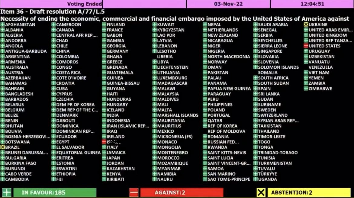 قطعنامه محکومیت سه دهه تحریم آمریکا علیه کوبا، با ۱۸۵ رأی موافق در برابر ۲ رأی مخالف (آمریکا و رژیم صهیونیستی) تصویب شد.