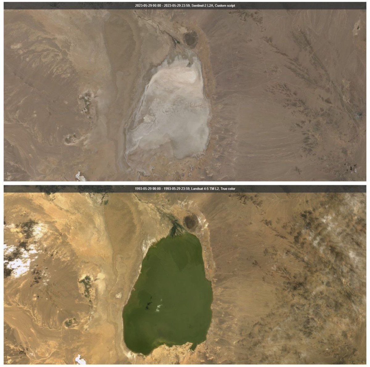 تصویر بالا مربوط به وضعیت تالاب گاوخونی اصفهان در بهار ۱۴۰۲ و تصویر پایین مربوط به بهار ۱۳۷۲.