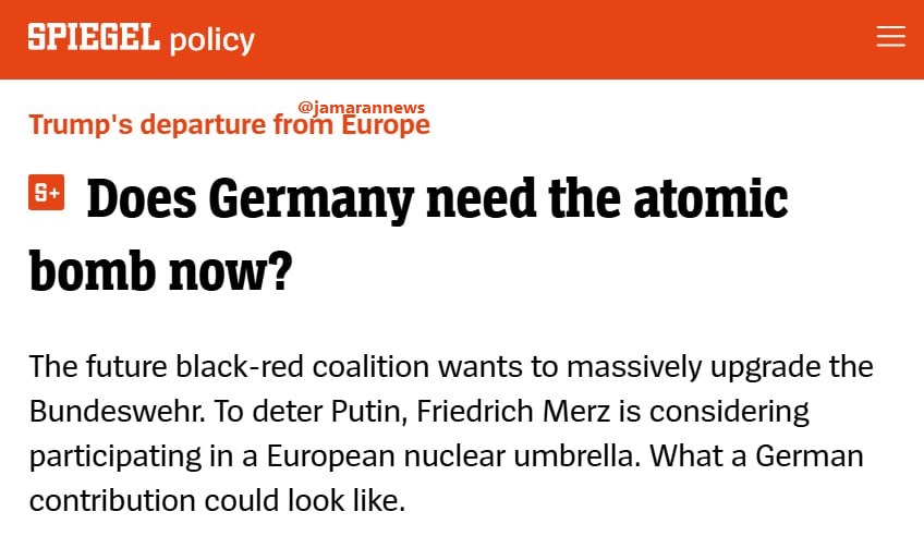 به گزارش جماران؛ اشپیگل با اشاره به جدایی و فاصله گرفتن ترامپ از اروپا، نوشته است: «در راستای بازدارندگی مقابل پوتین، فریدریش مرتس (صدراعظم بعدی آلمان) احتمال اینکه آلمان زیر چتر هسته ای اروپا قرار بگیرد را مدنظر قرار خواهد داد.»