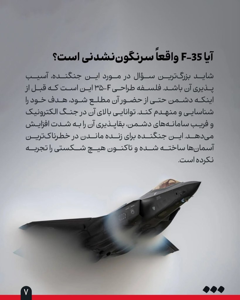 ارتش جمهوری اسلامی ایران پدافند هوایی، دو فروند هواپیمای جنگی اف 35 رژیم صهیونیستی را مورد اصابت قرارداده، منهدم؛ و ساقط کرده است. در ادامه با توضیح درباره این جنگنده به تشریح اهمیت آن میپردازیم: