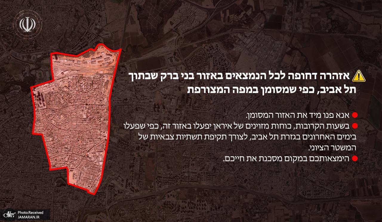 طی ساعات آینده نیرو هاى مسلح ایران در این ناحیه همچنان که طی روزهای اخیر در محدوده تل اویو عمل نموده است، برای حمله به زیرساختهای نظامی رژیم صهیونیستی وارد عمل خواهد شد.