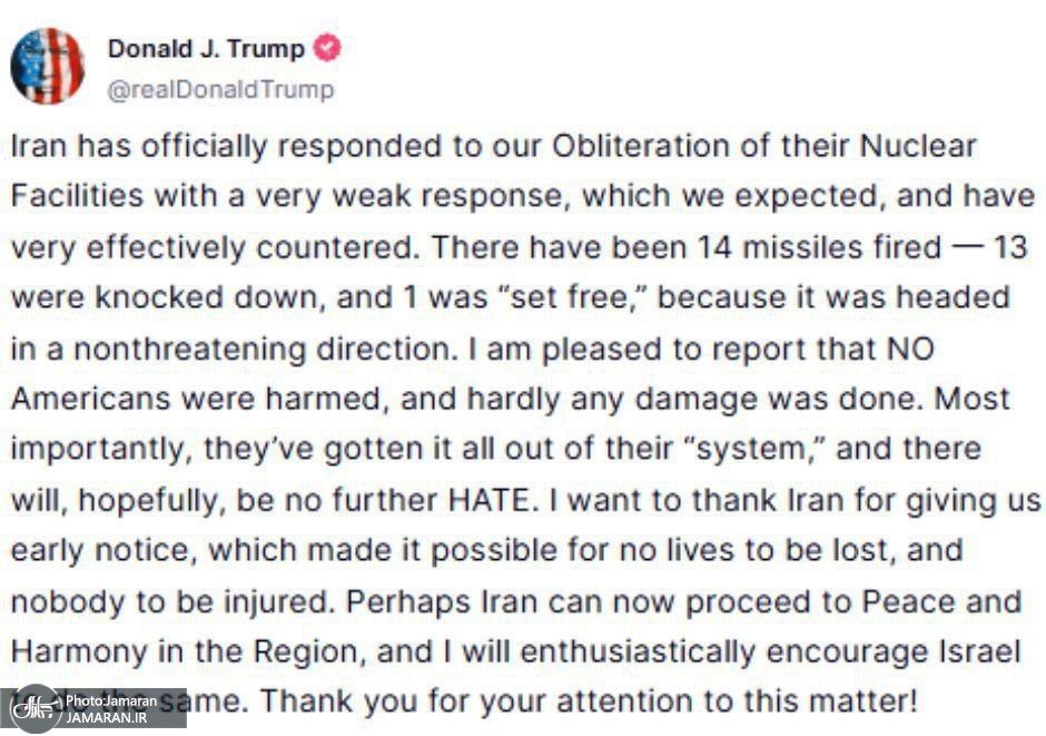 میخواهم از ایران به خاطر اطلاعرسانی زودهنگام تشکر کنم، که باعث شد هیچ جانی از دست نرود و هیچ کس زخمی نشود. شاید ایران اکنون بتواند به سمت صلح و هماهنگی در منطقه پیش برود و من با جدیت اسرائیل را نیز به انجام همین کار تشویق میکنم. از توجه شما به این موضوع متشکرم!