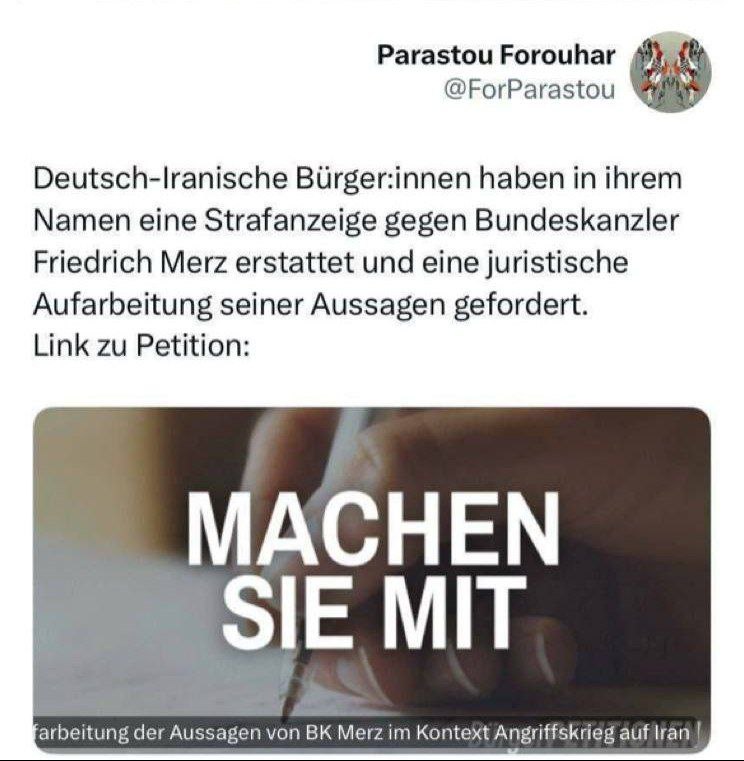 به گزارش جماران؛ پرستو فروهر (دختر مرحوم داریوش فروهر)، نویسنده و فعال حقوق بشر، به همراه گروهی از شهروندان آلمانی-ایرانی، با طرح شکایت کیفری از فریدریش مرتس، صدراعظم آلمان، خواستار تحقیقات قانونی درباره اظهارات وی در حمایت از حمله اسرائیل به ایران شدند.
