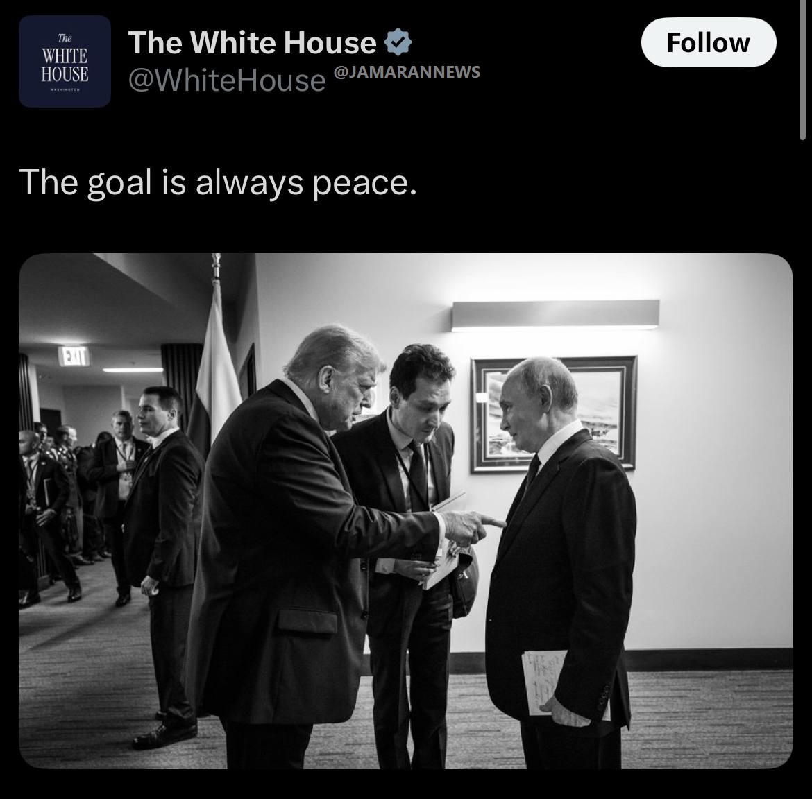 به گزارش جماران؛ کاخ سفید عکس دیگری از دیدار ترامپ و پوتین در انکوریج، آلاسکا منتشر کرده و نوشته است: «هدف همیشه صلح است».