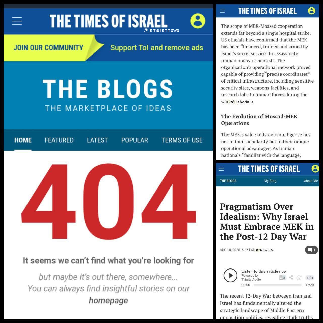 اما حذف این گزارش از تایمز اسرائیل اولا نشان از وحشت منافقین بخاطر رسوایی بیشتر در جامعه ایران و نگرانی از اسناد ارائه شده در دادگاه منافقین دارد.