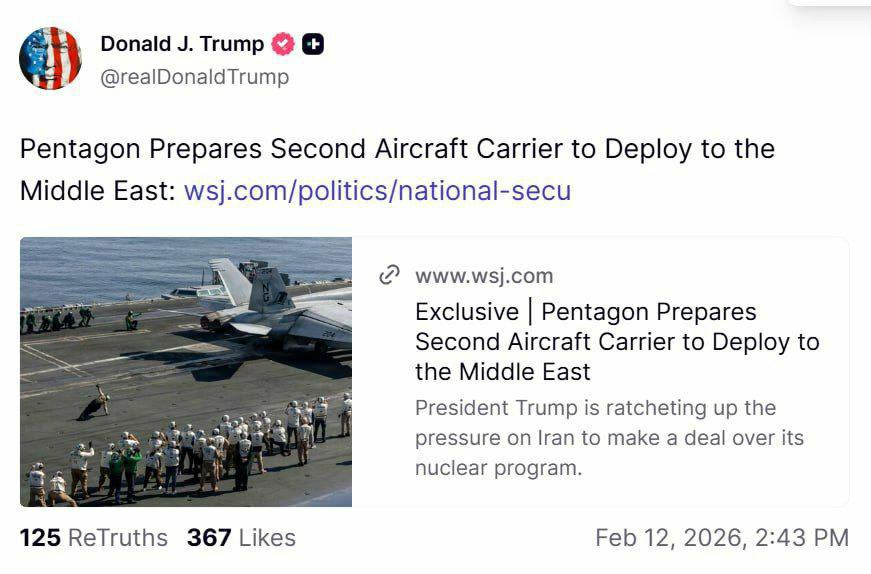 ترامپ خبر آماده سازی دومین ناوهواپیمابر آمریکا برای اعزام به خاورمیانه را در صفحه خود بازنشر کرد