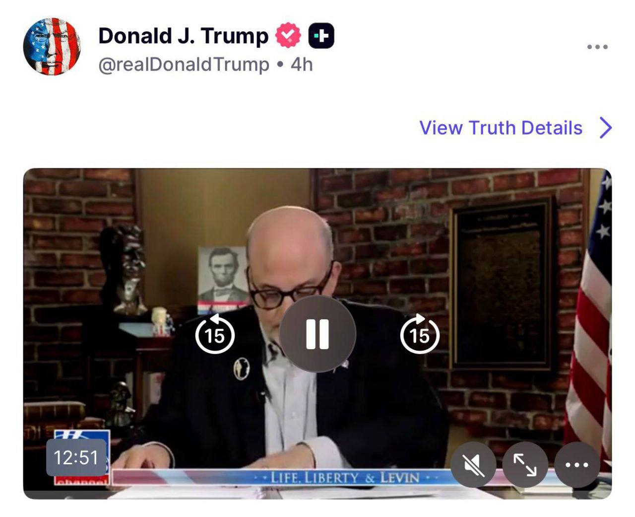 دونالد ترامپ، با بازنشر سخنان مارک لوین، روزنامهنگار محافظهکار، تردیدها درباره امکان دستیابی به توافقی پایدار با جمهوری اسلامی ایران را برجسته کرد. البته ترامپ در شبکه اجتماعی خودش همواره مطالب زیادی را به صورت انبوه بازنشر می کند.