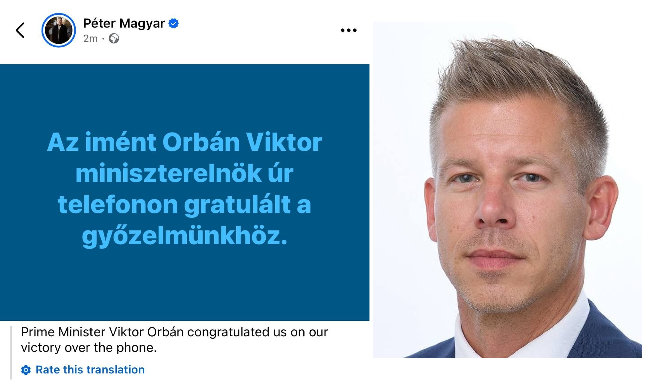 پیتر ماگیار میگوید که ویکتور اوربان پیروزی در انتخابات را به او تبریک گفته است.