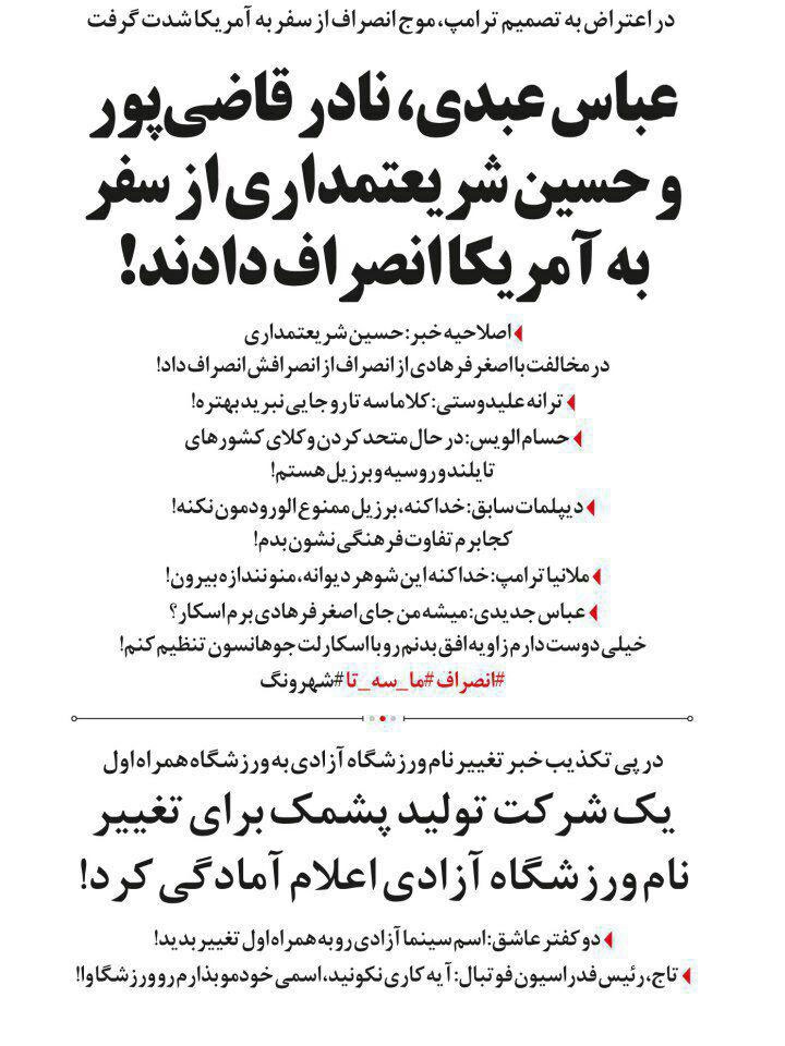 روزنامه شهروند در صفحه طنز امروزش به ماجرای تغییر نام ورزشگاه آزادی و محدودیت سفر به امریکا پرداخت.