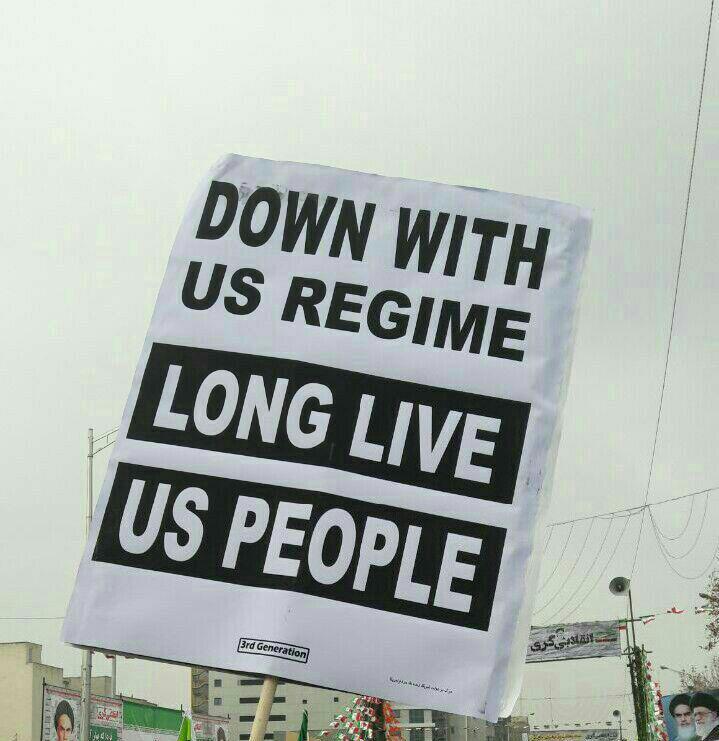 به گزارش جماران، در راهپیمایی 22 بهمن برخی پلاکاردها به زبان انگلیسی نوشته شده بود که روی یکی از آنها نوشته بود: «مرگ بر دولت آمریکا، زنده باد ملت آمریکا».