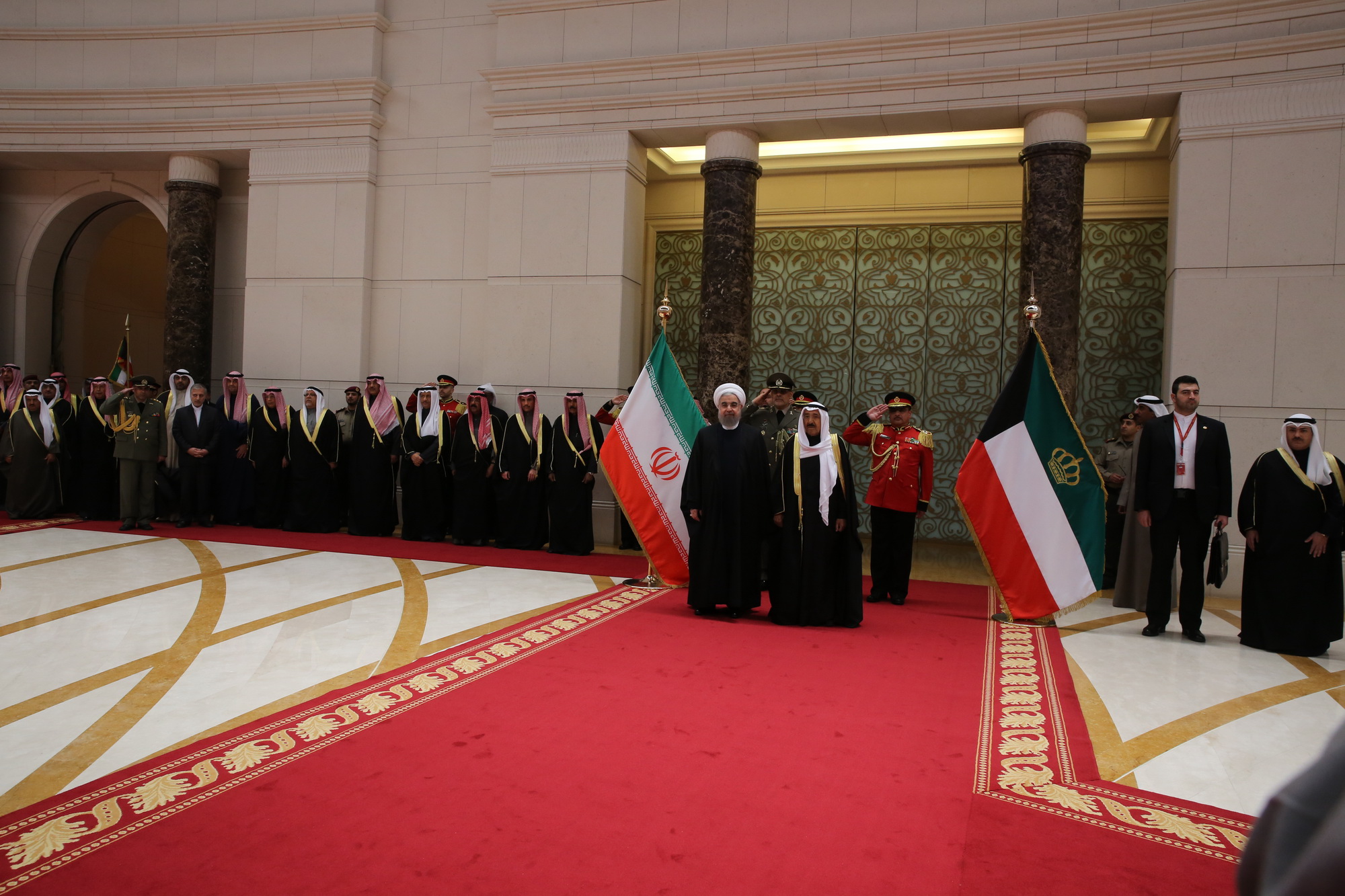 در مراسم استقبال رسمی سرود ملی جمهوری اسلامی ایران و کویت نواخته شد و اعضای هیأت‌های عالی‌رتبه دو کشور به دکتر روحانی و امیر کویت معرفی شدند.