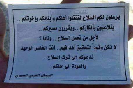 هواپیماهای ارتش سوریه اقدام به ریختن جزواتی در حومه جنوبی ادلب و بخشهای شمالی حماه کردند. این مناطق از جمله محورهایی است که عناصر مسلح در آنها سلاح خود را به زمین گذاشته و تسلیم شدهاند.