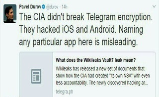 دورف در حساب توئیتری خود در پاسخ به این موضوع اظهار داشته که رمزگذاری این پیامرسان هک نشده و سازمان CIA با هک کردن گوشیهای اندرویدی و iOS توانسته به این اطلاعات دسترسی پیدا کند.