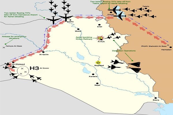 درطرح اولیه این عملیات ۱۲ فروند جنگنده فانتوم پس از برخواستن از پایگاه همدان با حرکت به سمت دریاچه ارومیه از دو فروند تانکر سوخت رسانی که بر فراز دریاچه منتظر آنها بودند سوخت خود را دریافت می کردند و سپس با پرواز به سمت نوار مرزی ترکیه و عراق از سمت شمال وارد حریم هوایی این کشور می شدند که در آنجا نیز پس از سوختگیری از دو فروند تانکر سوخت رسان که با استراتژی خاصی از فرودگاه دمشق پرواز کرده بودند با ادامه مسیر به سمت پایگاه های اچ-۳ آنها را مورد هدف قرار می دادند.
