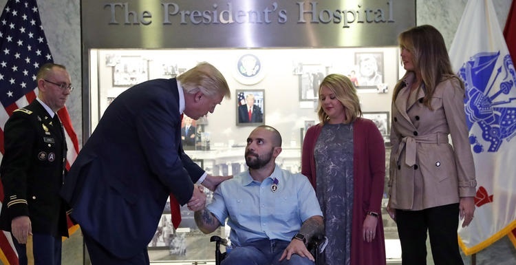به گزارش جماران، در تصاویر دونالد ترامپ و همسرش را در مراسم تجلیل و اعطای مدال به یک افسر مجروح ارتش آمریکا در افغانستان در بیمارستان نظامی در مریلند آمریکا مشاهده میکنید.