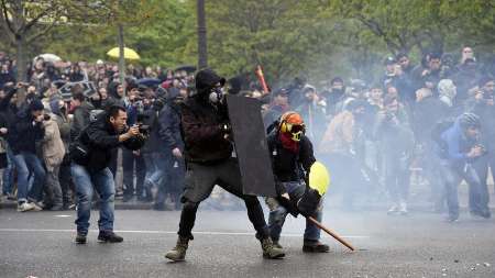 در تظاهرات امروز (دوشنبه) که در مرکز شهر پاریس انجام شد، جوانانی که صورت خود را پوشانده بودند، با استفاده از کوکتل مولوتوف و سنگ به نیروهای پلیس حمله کردند. بعد از این ماجرا نیروهای ضد شورش وارد عمل شدند که بر اثر این زد و خوردها، دو تن از نیروهای پلیس به شدت مجروح شدند.