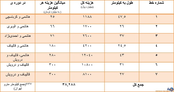 جدول زیر خلاصهای از هزینههای مترو تهران است. بادقت در این جدول به راحتی میتوان تفاوت هزینه و میزان کار انجام شده در دورههای مختلف و برای خطوط مختلف را با هم مقایسه کرد.