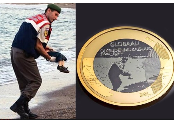تصویر آیلان کردی کودک سه ساله سوری که در سال ۲۰۱۵ در دریای مدیترانه غرق شد توسط دولت فنلاند بر روی پول ملی این کشور حک شد.