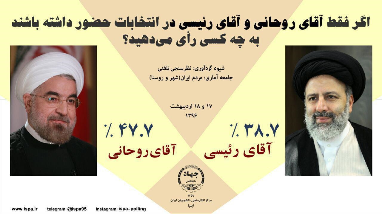 به گزارش جماران، جدیدترین نظرسنجی ایسپا با طرح این سوال که اگر فقط آقای روحانی و آقای رئیسی در انتخابات حضور داشته باشند به چه کسی رای می دهید؟ به این نتیجه رسیده است که ۴۷.۷ درصد به روحانی و ۳۸.۷ درصد بع رئیسی رای می دهند.