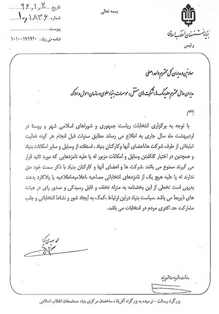 در این اطلاعیه آمده است: بنیاد مستضعفان انقلاب اسلامی ضمن دعوت از تمامی اقشار ملت بزرگوار ایران اسلامی جهت حضور پای صندوقهای رأی در روز ۲۹ اردیبهشت ماه، از آنجا که احتمال دارد برخی از هواداران کاندیداها، در برنامههای تبلیغی خود از بنیاد مستضعفان یا ریاست بنیاد نام ببرند، ضمن احترام به تمامی نامزدهای محترم به استحضار میرساند، سیاست بنیاد در انتخابات پیش رو کمک به ایجاد شور و نشاط انتخاباتی و جلب مشارکت حداکثری مردم در انتخابات بدون موضع گیری در خصوص هیچکدام از نامزد های محترم می باشد. این موضوع قبلا و طی بخشنامه شماره ۱۰/۱۸۳۶مورخ ۹۶/۰۱/۲۰ به تمامی کارکنان بنیاد هم ابلاغ گردیده است .