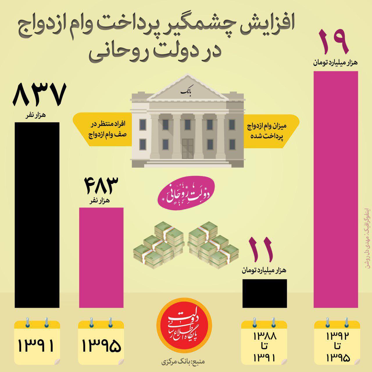 نظام بانکی با وجود تنگناهای مالی و اعتباری و به ویژه در سال‌های اخیر از خود عملکرد مناسبی را نشان داده و این امر شایسته تقدیر است. بر این اساس از ابتدای سال ۱۳۸۸ تا پایان سال ۱۳۹۱ تعداد ۴.۵۴۵.۹۸۷ فقره بالغ بر مبلغ ۱۱۱.۴۴۰ میلیاردریال پرداخت شده؛ این در حالی است که از ابتدای سال ۱۳۹۲ تا پایان سال ۱۳۹۵ تعداد ۴.۱۱۲.۱۴۶ فقره بالغ بر مبلغ ۱۹۱.۶۰۳ میلیاردریال تسهیلات قرض الحسنه ازدواج در اختیار متقاضیان قرار گرفته است. این رقم در مقایسه با دوره ۴ ساله از ابتدای سال ۱۳۸۸ تا پایان سال ۱۳۹۱ که مبلغ تسهیلات پرداختی حدود ۱۱ هزار میلیارد تومان است، نشان می دهد مبلغ تسهیلات پرداختی در دوره دولت یازدهم در مقایسه با دوره قبل، رشد بیش از ۷۰ درصدی داشته است.