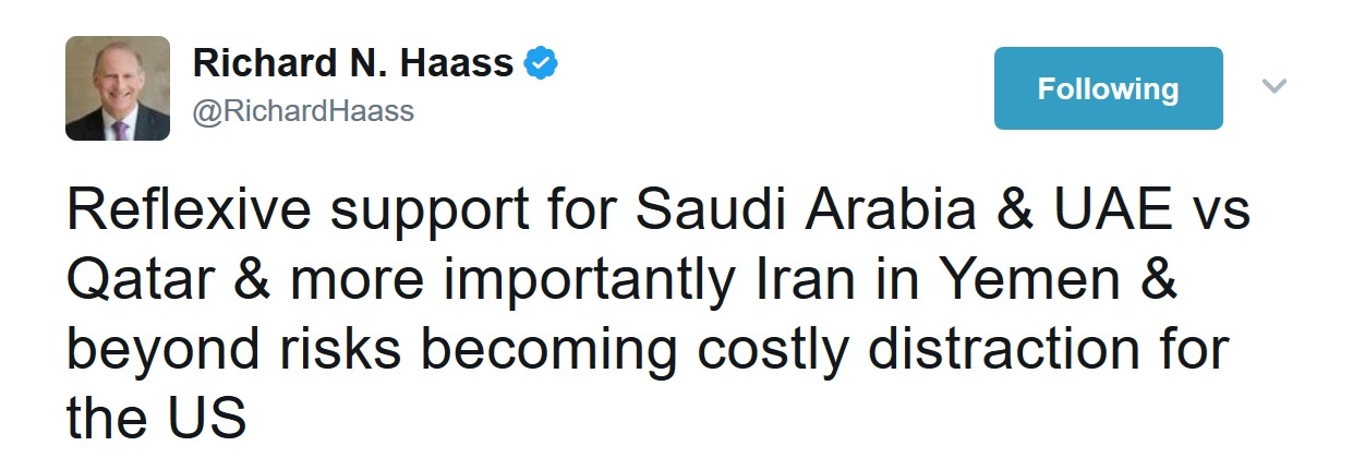 ریچارد هاس رئیس شورای روابط خارجی آمریکا در تازه ترین پست توئیتری خود، مطلبی را درباره تحولات قطر منتشر کرد.