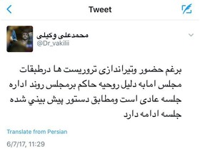 یک عضو هیئت رئیسه مجلس در توئیتی تاکید کرد که به رغم حضور و تیراندازی تروریست‌ها در طبقات مجلس، جلسه عادی مجلس در حال برگزاری است.