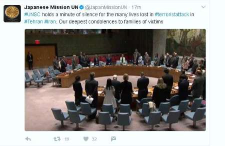 صفحه رسمی نمایندگی ژاپن درسازمان ملل نوشت: شورای امنیت سازمان ملل به احترام جان هایی که در حمله تروریستی تهران گرفته شد، یک دقیقه سکوت کرد.